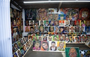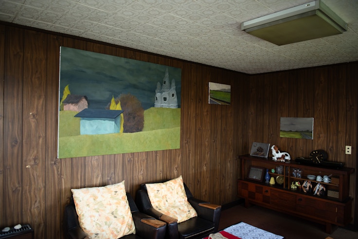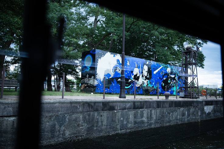 さらに北上し、富山港にもっとも近いエリアが岩瀬エリアだ。北前船の寄港地として栄えた往時の街並みが残るこの場所では、「満寿泉」の銘柄で知られる造り酒屋の桝田酒造店や北前船の北陸五大船主のひとつである馬場家など。桝田酒造の工場の扉は、陶芸家の葉山有樹が「工場で働く人々が誇りをもって働けるように」という思いを込め、竜を絵付けした陶磁を高精細の大型プリンターで拡大してアルミ複合板に転写したパネルで彩った。その内部にはコムロタカヒロのソフビを想起させる木彫作品や、布、糸、木枠で壮大な景色を生み出す岩崎貴宏の立体作品が、外壁には平子雄一の絵画が設置されるなど、酒蔵の一画にアートが溶け込む。