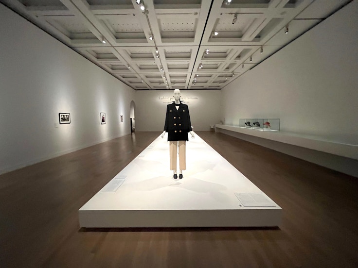 ほかにもネイビールックやサファリジャケットなど、サンローランは女性の社会進出が顕著となった時代と呼応するように、既存の男性服の要素を活動的な女性のための衣服としてつくり変えていった。そのいずれもが、現在のアパレルの店頭に並ぶ衣服にも受け継がれている。現代にも続くファッションの文脈を、会場に並んだルックからぜひ感じてほしい。