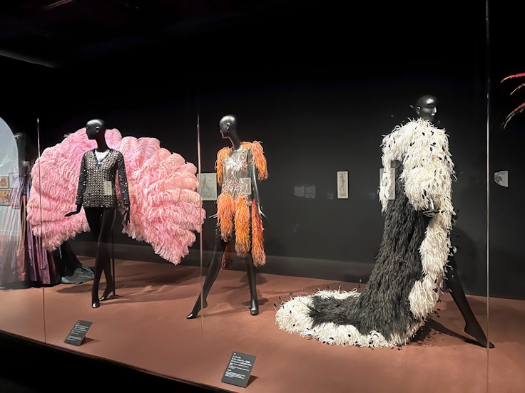 第3章「芸術性 刺繍とフェザー」では、サンローランのクリエイションを支えていた、織工、染色、捺染、刺繍、金細工、銀細工などの職人の技が光るルックを展示。精緻な技術があるからこそ表現できた、オートクチュールならではの存在感あふれる服を見ることができる。
