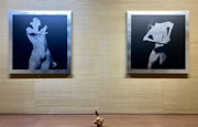 うろついていると、急峻な階段が見つかった。2階に上ってみると、奥まった室に写真作品《撮像舞踏般若心経考》と映像作品《身体化する般若心教, 踊る計算機自然のマニ車》がある。