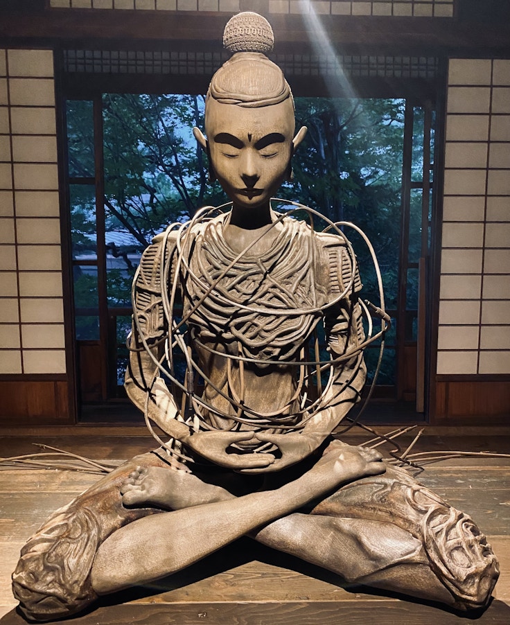 一室の中央に座す菩薩像は、人間とほぼ同じサイズ。身体に巻き付いているのは、初期コンピュータの記憶媒体だったテープの束だろうか。思惟にふける表情は端正で、ありがたさに溢れる。自然界とデジタル界を自由に行き来し、物質と非物質の世界をつなぎ、自然と生命の全体を理解する新たな視点を提供してくれる存在であるという。