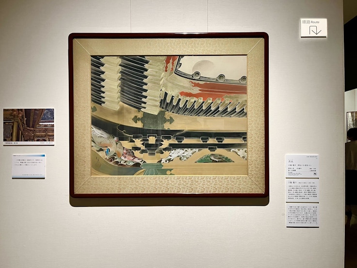 少し先に進むと、栃木県日光市にある輪王寺を題材にした川端龍子の《月光》が展示されている。これは3代将軍・家光を祀った大猷院の相の間を描いたもので、権現造りの屋根や装飾に焦点を当てたユニークな構図が印象的だ。右上にうっすらと描かれた月も、社殿の様子と相まって荘厳な雰囲気を感じさせる。