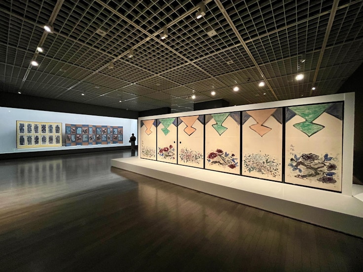 棟方が帰国すると、戦後の高度経済成長の影響で建設された様々な公共空間におけるクリエイションの依頼を受けることとなる。会場に展示される《花矢の柵》(1961)は青森県新庁舎(谷口吉郎による建築)竣工を記念して制作されたものだ。