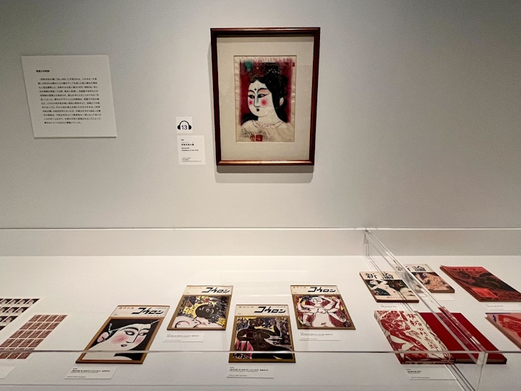 棟方は版画作品のイメージが強いが、じつは雑誌の挿絵やパッケージデザインなども数多く手掛けている。『中央公論』で連載をしていた谷崎潤一郎による小説『鍵』の挿絵も棟方が担当しており、印刷物になることを想定した真っ白な面のつくりが特徴的だ。