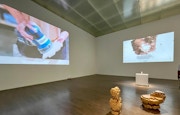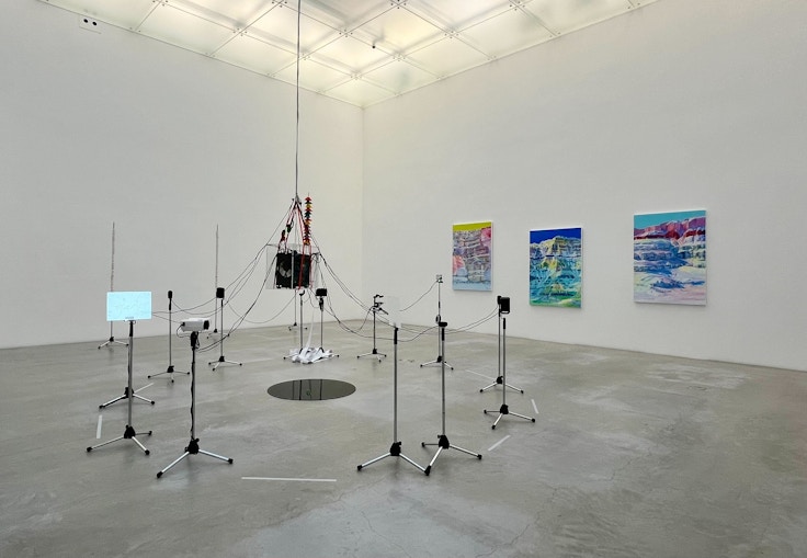 オーストリアを拠点に活動するジョナサン・ザワダは、「デジタル経験から得た感覚」をテーマに様々なアプローチを行うアーティストだ。本展で展示されている《犠牲、永続の行為》(2023)は、絵画や彫刻に加えて、様々なコンピューターシステムの要素を内包したマルチメディア・インスタレーション。記憶や回想に関わる3つのヒト染色体情報をもとに地層が描かれた絵画をウェブカメラが読み込むことで、機械学習を通じてテキストや音声データへと変換されるといった、多視点的な作品だ。