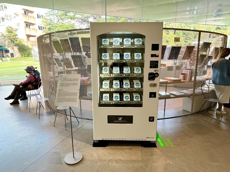 ミュージアムショップ脇に設置された不思議な自動販売機は、松田将英によるプロジェクトだ。なかにはSNSにおける「認証マーク」バッジが並んでおり、1000円で誰でも購入できるかたちとなっている。デジタル社会において、自身の身体に認証マークを与えることで、その価値をユーモラスに問いかけるものだ。なお、100分の1の確率で金沢箔が施された特別な金色バッジが当たるため、ぜひ試してみてほしい。