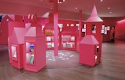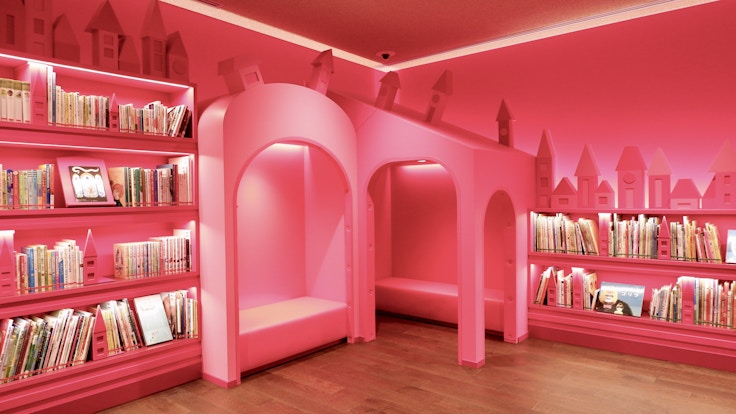 奥に進むと、そこは「コリコの町の本棚」のエリア。いちご色の世界の空間には、椅子やソファ、カーペットスペースが点在している。メリーゴーランドに乗るような高揚感、秘密基地にこもっているような安心感、座る場所によって異なる感覚に包まれて本と向き合うことができるのだ。むしろ、手に取った本に合わせて読む場所を決めることができるのが、この施設の魅力のひとつだと感じられるかもしれない。