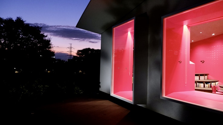 同じく2階の「栄子さんのアトリエ」では、愛読書や直筆原稿、絵具の並ぶデスクの再現展示が楽しめる。さらに愛好するファッションを紹介するショーウィンドウや、奥には映像コーナーもあり、同館の誕生経緯や同館を貫く「いちご色」との関係も紐解かれている。