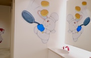 帰路につこうと1階に降りる途中では、「おうち型」の本棚の一角に「栄子さんへのお手紙POST」の存在や、壁に記された「本をひらけばたのしい世界」という角野栄子の言葉と出会う。またトイレでもキャラクターの存在を感じられ、館内のどこを移動していても発見と出会いにあふれた空間となっている。