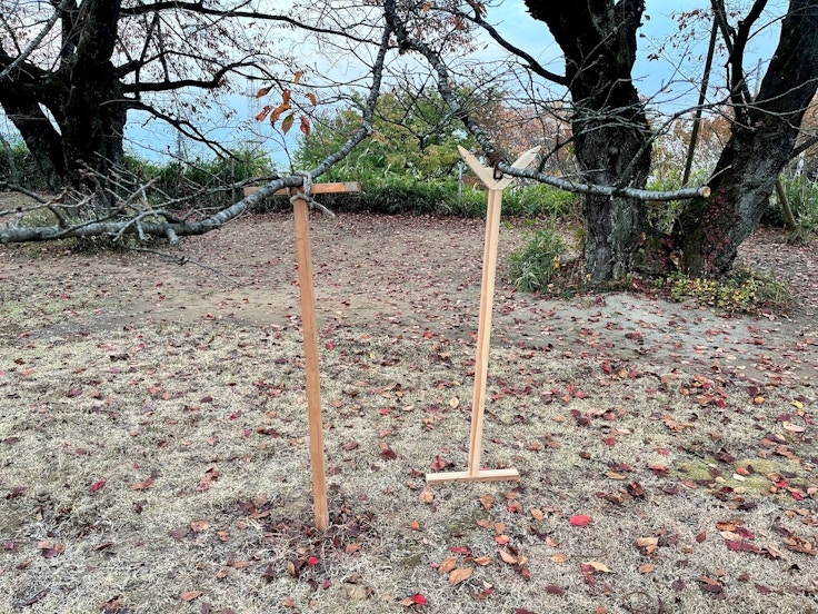 村を囲むように植えられている桜の木に使用されている木製の支えを逆さまにつくった《逆頬杖 / 逆さ鳥居》では、用途を逆さにしたことで、伸びる枝の方向も逆さのではないか、といった意図と力学の考え方を組み直す実験的なアプローチが行われている。なお、この支えが役割を終えたときは、それを讃える記念碑がつくられる予定だという。