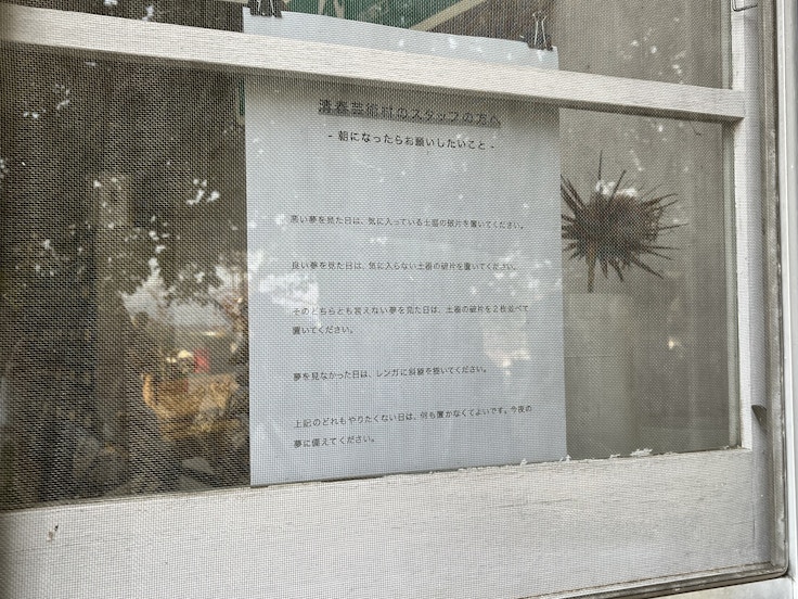 現代アーティストの泉太郎は、人智を超えた物事と人との関係性を交感し続けるようなシステムを構想し、「巨人と玩具」シリーズを村内に展開している。例えば、村内にあるアーティストのための創作の場「ラ・リューシュ」の周りには、あるルールをもとにレンガの上に石のかけら(オストラコン)が置かれている。これは、芸術村のスタッフが連日見る夢に関するシステムが可視化されたものであり、エジプトにある古代の埋葬地でとある書記官によって行われた「夢のオストラカ(夢日記を陶片に記した)」のストーリーに由来するものだ。