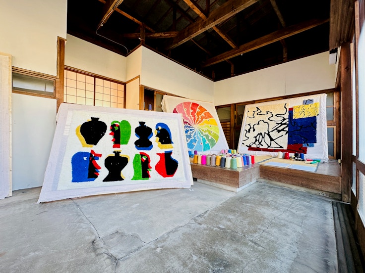 コレクティヴのように国内外のアーティストとコラボレーションをしながらインテリア雑貨を制作するブランド、パシフィカ コレクティブス。糸の手染めから制作までができるよう、職人たちとネットワークを築き、作風を反映しながら職人や素材、技法を選定するという。会場ではBIENやDIEGO、KINJOといったアーティストとともに制作したアートラグが展示されている。