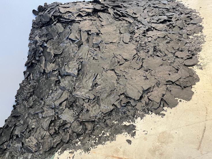 表面を覆う素材は、富士吉田のテキスタイル産業を支えてきた人々の手足をシリコンで型取りしてつくられたもので、この土地にある記憶を物語として提示。さらに、床には踏むと砕け、乾いた音を立てる破片があり、人々の干渉によって展示空間が変化していく。