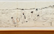 また波の青にも注目だ。使用されているのは、18世紀初頭のベルリンで人工的につくられた合成顔料「ベロ藍」。北斎は水に溶けやすく濃淡を出しやすいこのベロ藍を使用し、色鮮やかな波を実現させた。いっぽう、ベロ藍以前の露草や本藍を使用した他の絵師の作品はどうだろうか。見比べることで、同じ「青」でもその違いがはっきりとわかるはずだ。