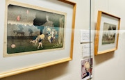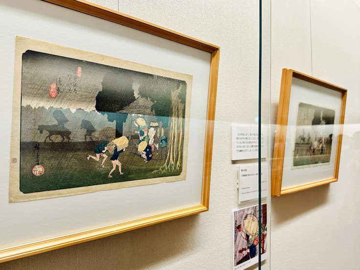 浮世絵版画は最初に200枚程度を摺る。また多いときでは7000枚もの摺りが重ねられた記録もあるという。その摺りの早い遅いによって、雨の線、空の色、色の版のズレなど、表情が大きく変わるものもある。会場では、こうした摺りの違いを比較するという楽しみ方も提示されている。