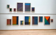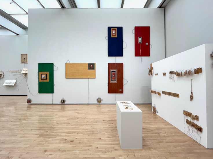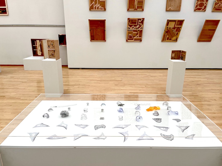 本展は豊嶋の作品を制作年にとらわれず横断的に紹介する構成だ。最初の展示室では、本来は鑑賞者から見えないパネルの裏面に木枠を増やし続けた「パネル」(2013-15)や、パネルの裏面の骨組みをつなげて収納部分や密封空間をつくる「隠蔽工作」(2015)といったシリーズが並ぶ。一見するとキャンバスの木枠のようにも見えるが、その印象こそが見る側の固定概念であり、本作と対峙するとその固着したイメージそのものが揺さぶられる。