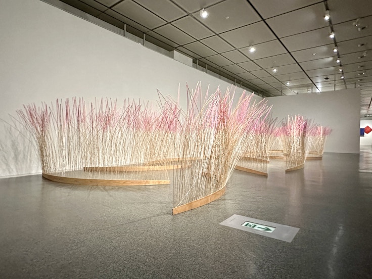 本展会場はおおよその時系列で構成。序章「糸との出会いー川島繊維時代」から始まり、1章「糸の発見、ファイバーアートの誕生ーローザンヌとウッヂでの試み」、2章「糸と空間、ファイバーアートの拡張ー京都とテキスタイル・マジシャン」、3章「糸の繋がり、ファイバーアートの展開ー『ギャラリーギャラリー』とデザイン・ワーク」、そして4章「糸、そしてファイバーアートの向こうへ」となっている。