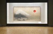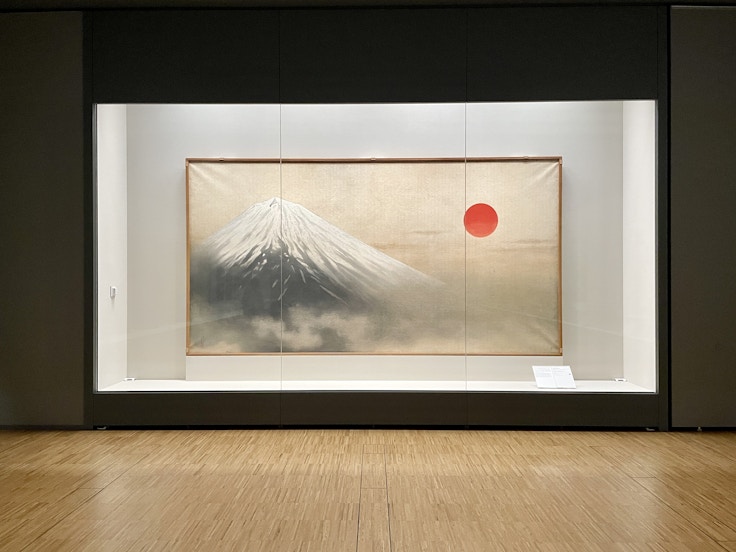 第2章では、明治以降の皇室の御慶事や各行事に際して明治宮殿(戦中の空襲で焼失をしていしまった皇室の施設。救出された作品は現在同館に収蔵されている)の室内を飾っていた様々な工芸品が並んでいる。とくに、優れた技術を評価された帝室技芸員たちによってつくられた陶磁器や銀器、銅器、横山大観が描いた2000点におよぶ富士の絵のなかでも最大級の《日出処日本》(1940)などの大型の作品が印象的だ。