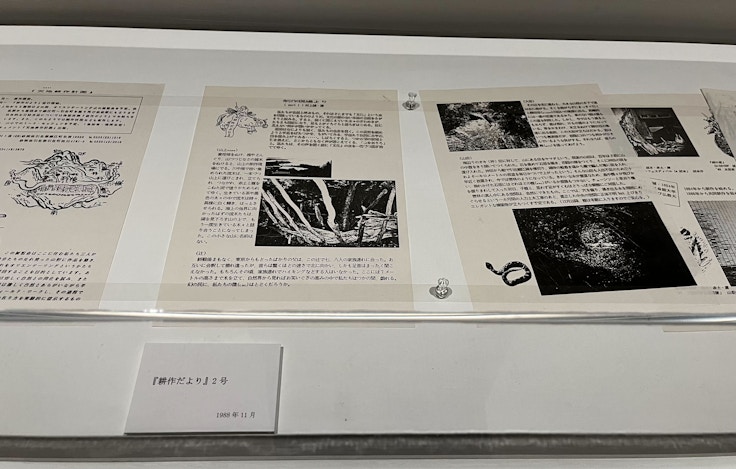 会場では、3人の初期作品から、天地耕作以前の活動、浜松市内あるいは海外での活動、そして野外作品を舞台としたパフォーマンスの様子などが、研究資料や写真、スケッチなどを通じて紹介されている。