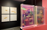 磯谷博史は、長年使用されてきた博物館の展示ケースのなかに発光するふたつのガラスのボトル作品《花と蜂、透過する履歴》(2018)を展示。ボトルのなかには蜂蜜が満たされている。蜂蜜の腐らない特性は、「博物館の所蔵品より長く保存され、博物学の最適なメタファー」(おおうち)だという。