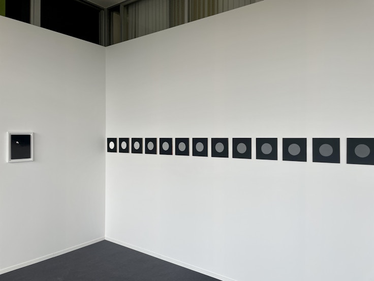 「満ち欠けの先に、四つの月」というタイトルの五月女哲平の展示では、会場外の松本城を借景し、正方形の黒いパネルに色の微妙なグラデーションで同じサイズの円が描かれた連作が並ぶ。複数のシャンデリアによる米谷健+ジュリアのインスタレーション《クリスタルパレス:万原子力発電国産業製作品大博覧会》は、1点1点に原発保有国の国名を付け、同国の原発による電力の総出力規模をシャンデリアのサイズに比例させたもの。ウランガラスを用いて制作された同作では、ブラックライト照射によって幻想的な緑色の光を発している。