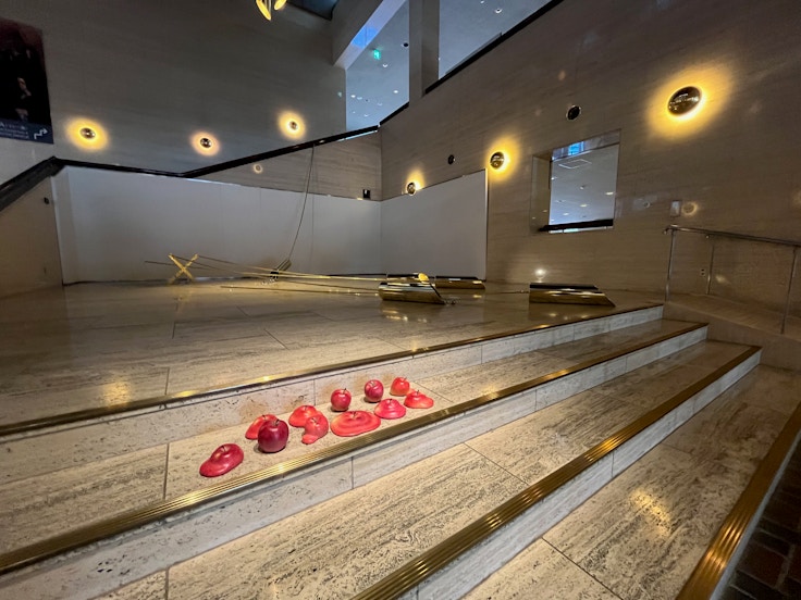 《まだ落ちていないほうの吊り下げ照明》は、ひしゃげてガラスが割れ、不規則に電灯が点滅している照明の作品で、上部吹き抜けにある吊り下げ照明が落下した姿を表している。そして《Apple》は実物大の木彫彩色のりんご11個が、それぞれ溶解しているかのように展示されている。