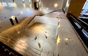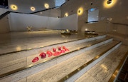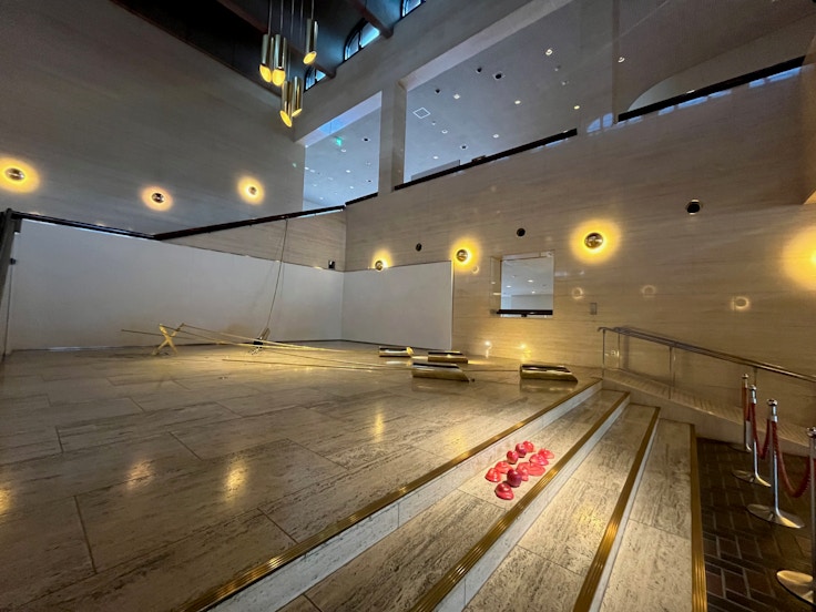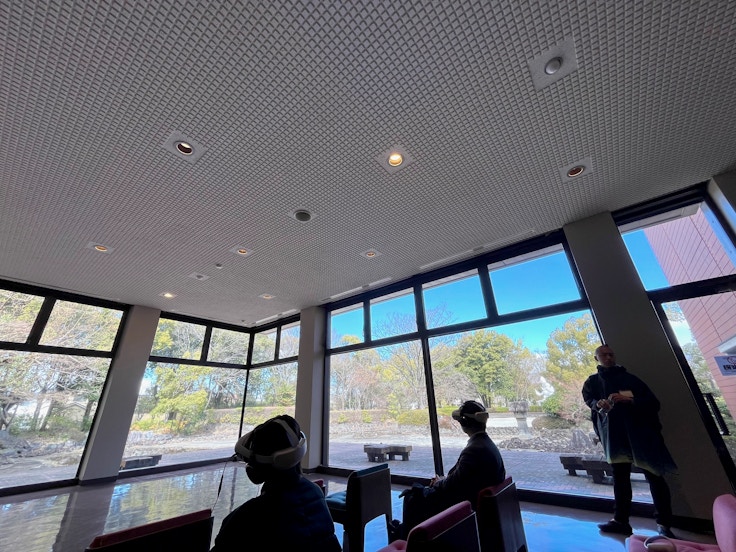以上のような映像を鑑賞した後にヘッドセットを外すと、目の前にはVR空間と同じ椅子が並んだロビーが現れる。しかし、例えばVRのなかで子供たちが居たガラスの向こう側にある庭園や、雨宮が積み重ねた椅子一つひとつの造形、そして風船が漂っていた天井の高さなど、VR空間での経験を得たことで、現実のロビーの空間の存在感がより強まっていることに気がつく。