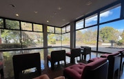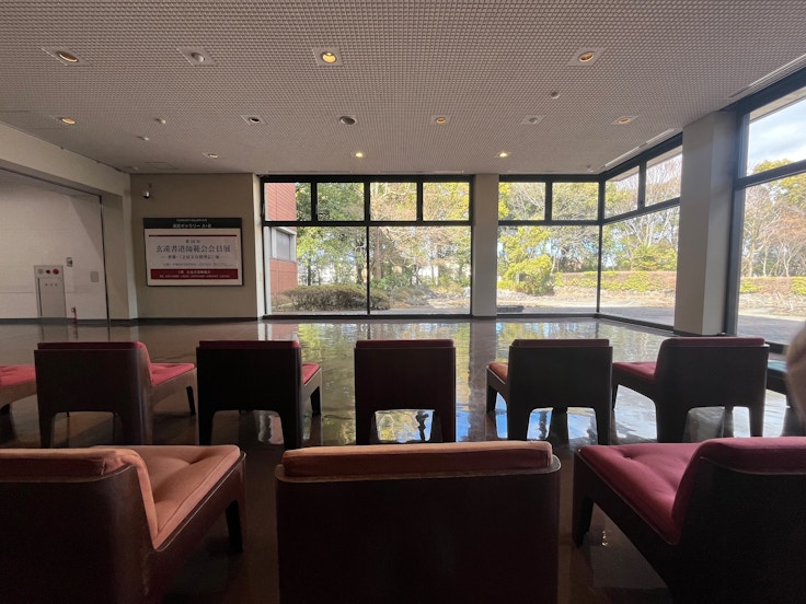 本展のメインである《VRまだ溶けていないほうの山梨県美》は、ロビーに置かれた椅子に座り、VRヘッドセットとヘッドホンをつけて体感する作品となる。ヘッドセットをつけると、鑑賞者が座っている美術館のロビーの映像が映し出され、前川國男が設計した美術館建築の特徴ともいえる、外と一体化するかのような大きな窓を中心にVR上で雨宮のパフォーマンスが上演される。