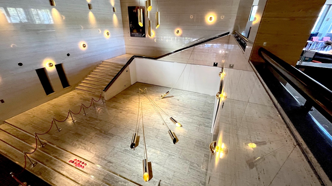 本展は美術館エントランスの吹き抜けにある「ギャラリー・エコー」と、1階ロビーの2ヶ所で展開される。まず、来館者の多くが最初に目にするであろう「ギャラリー・エコー」の作品を紹介したい。ここでは《まだ落ちていないほうの吊り下げ照明》と《Apple》というのふたつを組み合わせた「リアル」の作品が展開されている。