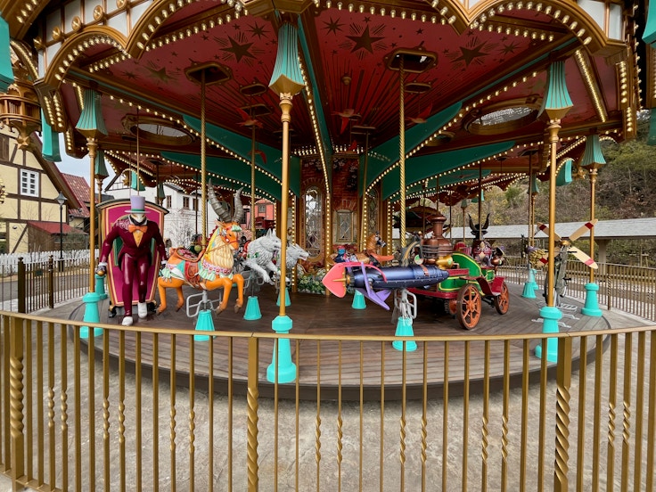「年に一度、村にやってくる移動遊園地」をイメージしたメリーゴーランド。乗り物はどれも『魔女の宅急便』「ハウルの動く城」『もののけ姫』(1997)といった作品に登場するキャラクターや動物をモチーフとしたもので、見ているだけで楽しくなる。