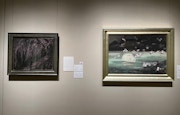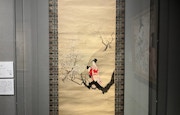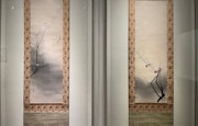 いっぽう、速水御舟《牡丹花(墨牡丹)》は墨の滲みを活かしながら、牡丹の豊かな花弁を表現した一幅。葉のやわらかな質感や淡い白緑の色彩など、高い技術で存在感あふれる牡丹を表現した。おなじく御舟による二幅の掛け軸《紅梅・白梅》は、月夜に輝く紅白の梅を対で描いており、単純化された枝ぶりがその奥ゆかしさをより強調している。