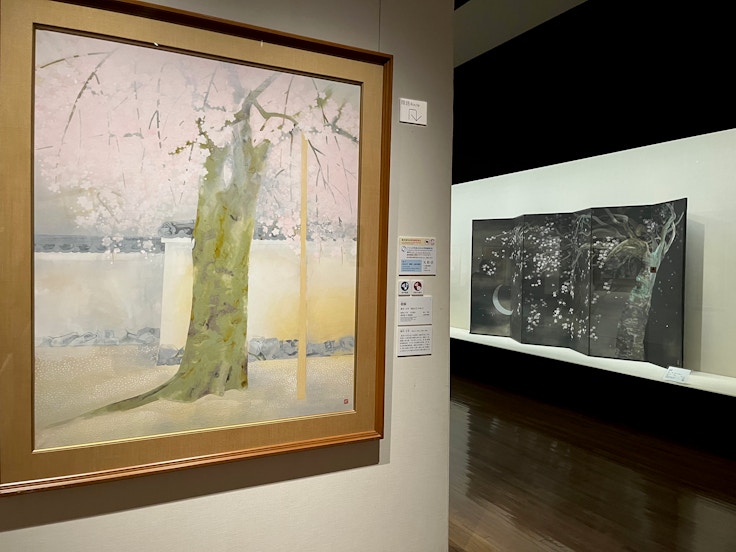 ほかにも桜を題材にした作品は多く、稗田一穂《朧春》や千住博《夜桜》は、夜の桜の儚げで幻想的な様を描き出している。なかでも古くは豊臣秀吉が花見を開催した京都・醍醐寺の桜を描いた奥村土牛の《醍醐》は、薄い絵具を幾重にも塗り重ねることで表情豊かな花の広がりと幹の質感を表現した、土牛の代表作ともいえる作品だ。