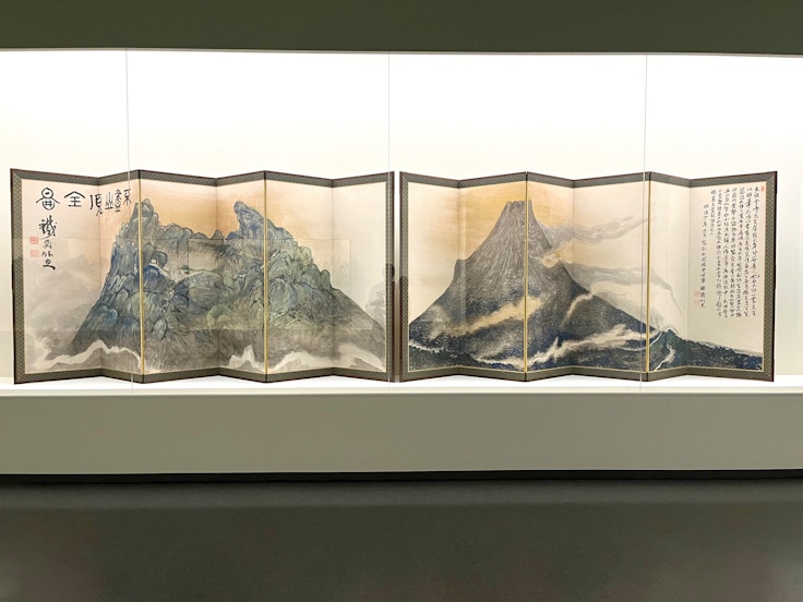 本章でもとくに多くの人の目を引く作品と言えるのが《富士山図》(1898)だ。生涯において幾度も富士山を描いた鉄斎だが、本作はとくに異彩を放っているとされる。右隻に富士の山容を、左隻に火口をクローズアップするという独特の構図とともに、江戸期の文人である池大雅、高芙蓉、韓大年が連れ立って富士山、立山、白山の三霊峰に登った逸話を賛として記している。