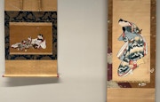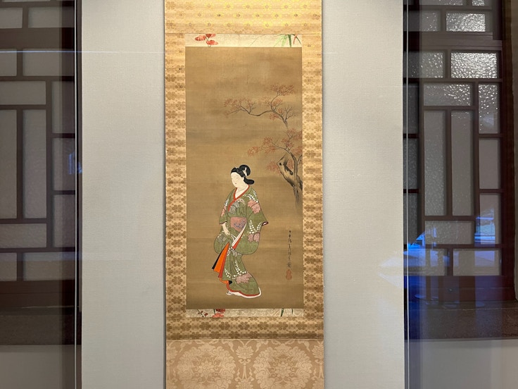 懐月堂安度は絵馬屋の出身とも伝えられており、《立美人図》(1704〜16頃)のように太く誇張された輪郭線による迫力ある美人画が人気を集めた。また、この作風を継承した門下の懐月堂安知の作品も併せて会場では見ることができる。