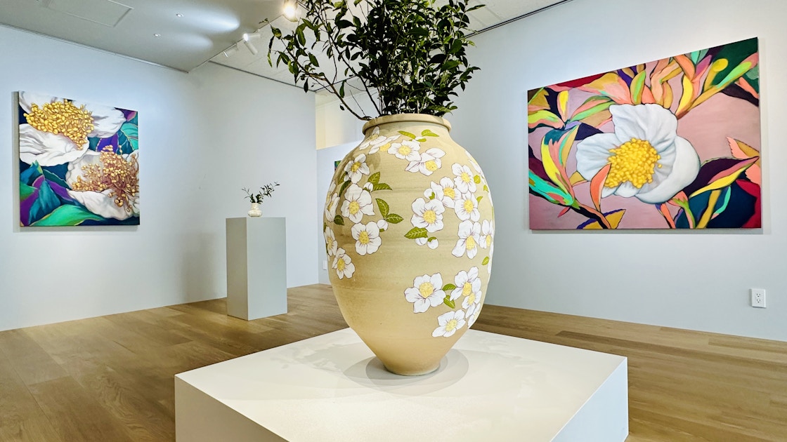 戸田は2年前に宇治の黄檗宗萬福寺のレジデンスプログラムに参加し、その際、巨大な茶壺を譲り受けたという。本展では、この茶壺に茶の花を描き、展示室の中央に展示。また、茶園で行ったフィールドワークをもとに取得した知識をもとに、11点のペインティングを制作した。