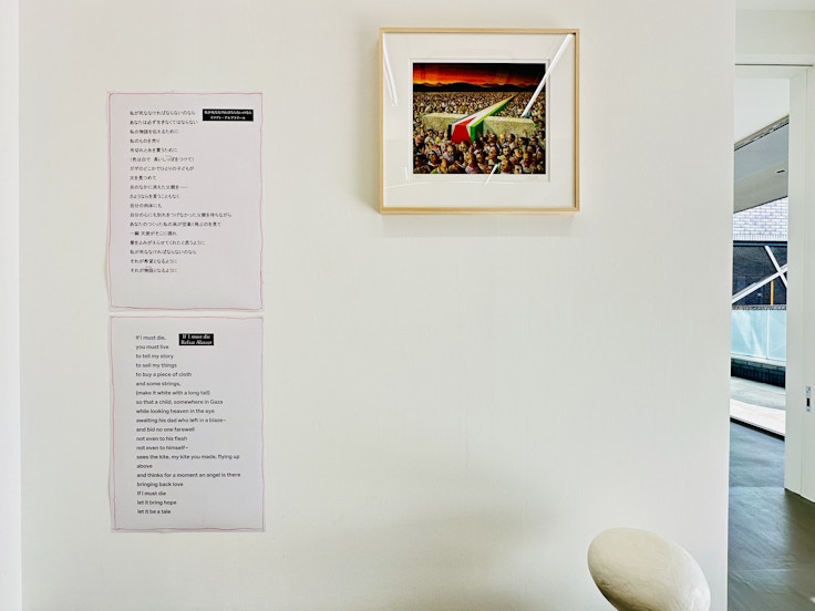 まず、会場に貼られているリフアト・アルアライールの詩に注目したい。アルアライールは昨年、イスラエルの空爆で死亡したが、その死を悟っていたかのうような詩を残していた。「私が死ななければならないのなら、あなたは必ず生きなくてはならない」という本展のタイトルは、この詩の冒頭からとられている。この詩の最後は「それが希望となるように、それが物語(テイル)となるように」と締められているが、ヘンクのキュレーションはまさにこの物語をつむぐアーティストたちの姿を伝えようとするものだ。