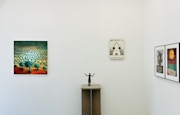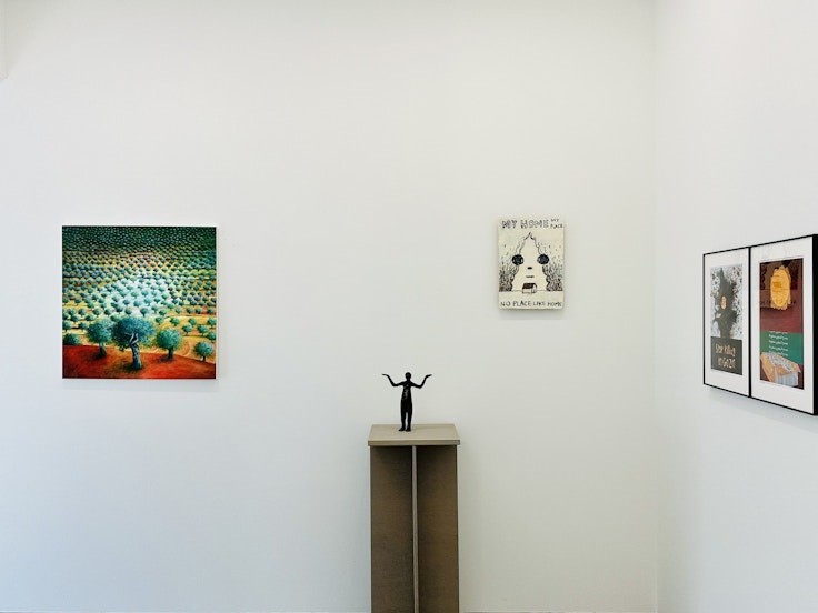 会場で紹介されているのは、フィシュの彫刻作品やドローイングのほか、リフアト・アルアライール(1979〜2023)、ムスアブ・アブートーハ(1992〜)の詩、スライマーン・マンスール(1947〜)のエディション作品、そしてガザのためにアーティストたちが制作したポスター(Posters for Gaza)などだ。さらに長年フィシュと親交があるという奈良美智(1959〜)の、今回のアクションに賛同した新作も展示されている。