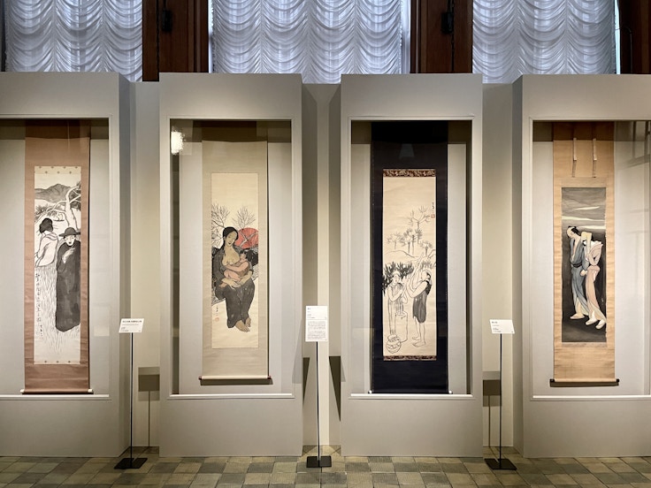 また、同じフロアに展示された軸装の《加茂川》(1914)と油彩画の《女》(1918)は、夢二郷土美術館創設者で初代館長の松田基が1951年に梅田の古書店で出会い、初めて購入した夢二の作品。この出会いを機に夢二の里帰りを念じた本格的な作品収集を開始し、15年後の夢二郷土美術館の創設に至った。