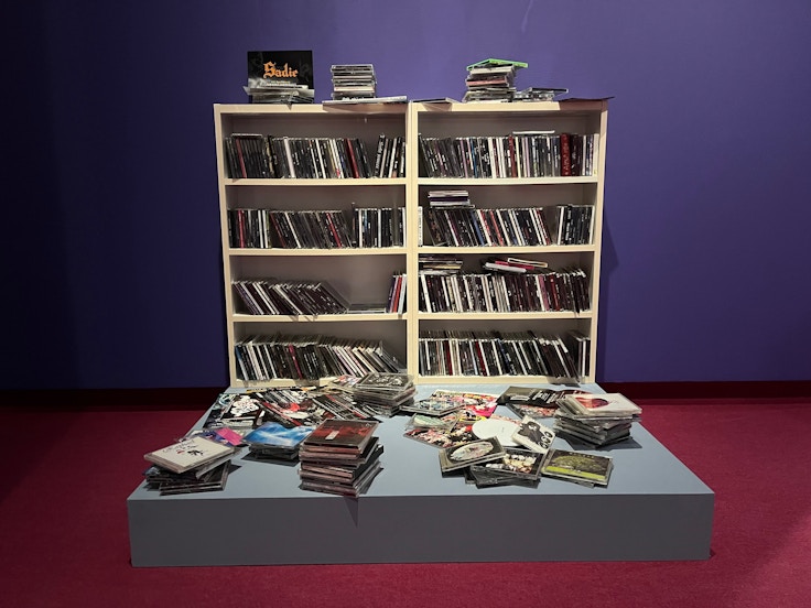 例えば本展では、梅津が30年以上にわたり追いかけ続けているビジュアル系のミュージシャンたちのCDが展示されているが、これらの音楽について梅津は「本当は美術史以上に自分に影響を与えている」と語る。梅津の初期のドローイングがまとっているどこか耽美的で退廃的なイメージは、梅津が拘泥するビジュアル系の世界観ともリンクしているのだろう。