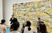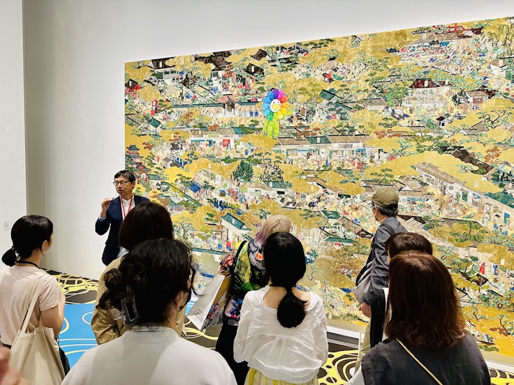 曾我蕭白の《雲龍図》に触発され、自ら筆をとった全長18メートルの雲竜赤変図《辻惟雄先生に「あなた、たまには自分で描いたらどうなの?」と嫌味を言われて腹が立って自分で描いたバージョン》(2010)と、向かい合うように設置された《金色の空の夏のお花畑》(2023-24)。前者については、アーティスト・村上の画力の高さにあらためて驚く声も上がった。いっぽう本展メインビジュアルにも使われている後者は、尾形光琳の《孔雀立葵図屏風》を思わせるもの。お花のモチーフが整然と並ぶ、一見シンプルな作品だが、お花の目はそれぞれ異なる色彩の組み合わせとなっており、背景の金箔も箔押師による手仕事だ。その技巧的な部分の解説に、鑑賞者らは熱心に耳を傾けていた。