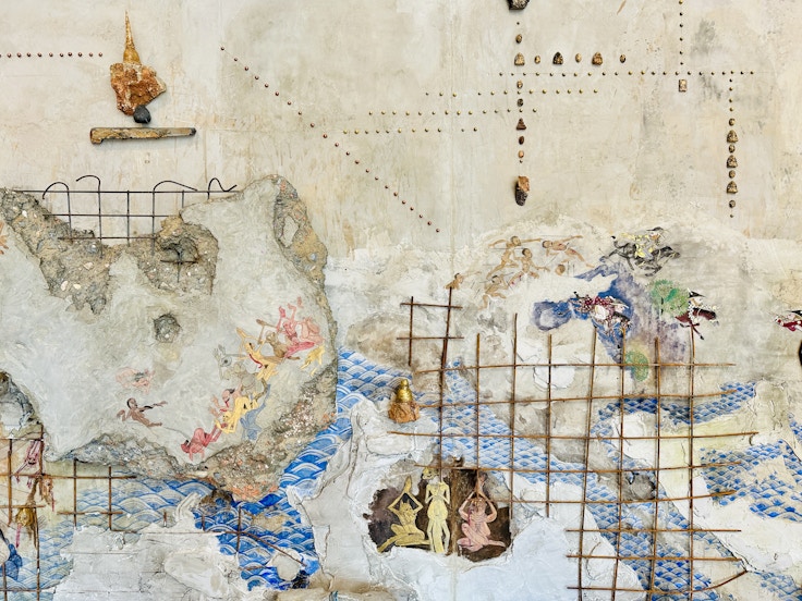 仏教の教えと生活の関連性をテーマに作品を生み出すパナパン・ヨドマニーの《Aftermath》(2016)は、壁面全体を使った大型作品。天然素材とコンクリート、荒廃した寺院で拾い集めたパゴダをはじめとするオブジェが組み合わせられており、ひとつの地獄を描いたランドスケープのようだ。タイの伝統的なモチーフを散りばめ、喪失や悲しみ、輪廻、変化、進展などへの考察を促す。