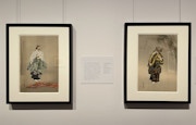 例えば、《能楽図絵二百五十番 朝顔》は舞台係がカーテンの陰から顔を覗かせながら、俳優が衣装を着る様子を描いたもの。耕漁はここで、能楽の主人公から幽玄さを取り除き、たんに衣装を着た人間として表現した。