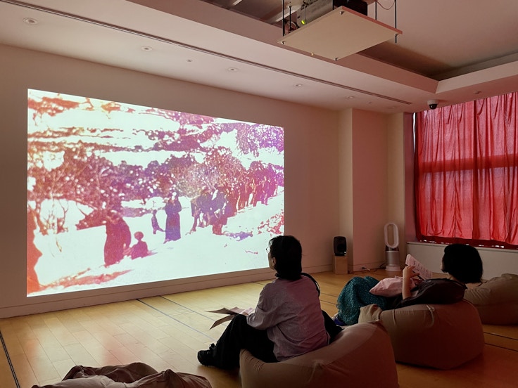 青柳菜摘と細井美裕は、本展で初めてコラボレーションを行い、インスタレーション《新地登記簿》(2024)を発表。東京湾の人工島(埋立地)で収録された映像と音声の素材をもとに、青柳の映像と詩、細井の音響を通じて、現在の東京から遥か遠くの過去や未来を想像する。
