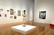 例えば1982-83秋冬コレクションで発表されたドレスは、この時代の髙田の代表作のひとつといえる。「花」をテーマとした本作は、髙田が20年かけて集めたリボンを約200メートルにわたって使用したといわれ、手仕事の贅が尽くされている。加えて、民族的な意匠とともに、平面と立体の裁断が巧みに組み合せた複雑な構造が存在感を際立たせる。会場では本作を、モデル・山口小夜子がまとったランウェイの写真とともに見ることができる。