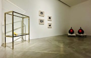 磯谷は、《カプリバッテリー》と対峙するように《花と蜂、透過する履歴》(2018)を見せる。「ボイスの存在に気がついたのは東京藝大に入ってから。現代美術をやるなかで、ボイスの意図がだんだんわかってきた。ボイスの作品は周辺の出来事を含めて成り立っている。私はそこに憧れる」と語る磯谷。赤いガラスの大きな電球のように見える《花と蜂、透過する履歴》は、内部を100kg近いハチミツが満たしている。ボイスがハチミツに興味を持っていたこととも関連しており、わずかな熱で変化し続ける状態が、「彫刻」として閉じ込められている。