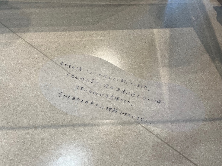 さらに、会場中に鈴木本人のコメントを記した足跡のかたちをしたメモが貼られている。鈴木の作品を見るだけでなく、その作品を制作する過程にあった思考まで、来場者はたどることができる。