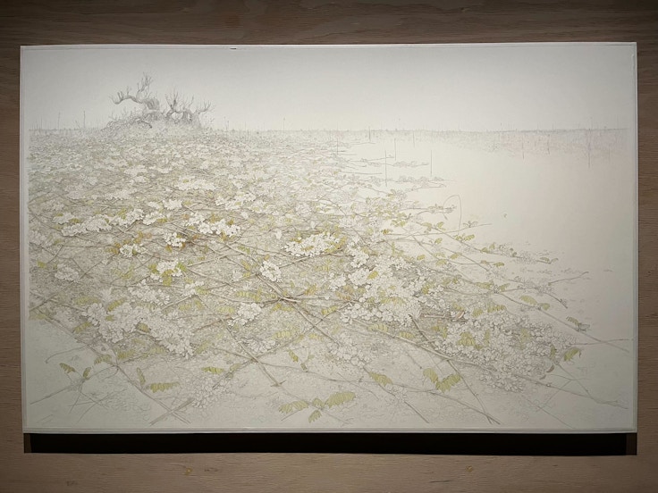 また、制作中の作品も展示されている。これは宮城県仙台市のとある住宅地で育てられていたフジの木が、更地になった地面を這いながら白い花や葉っぱをつけている様子を描いたものだ。倉科によると、つる性を持ち通常下に垂れる形で花を咲かせる藤の花が地面で咲くことは稀だという。作品の途中経過を見ることができるのも貴重な機会であるため、ぜひこちらの作品にも注目してみてほしい。