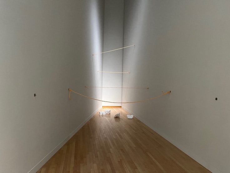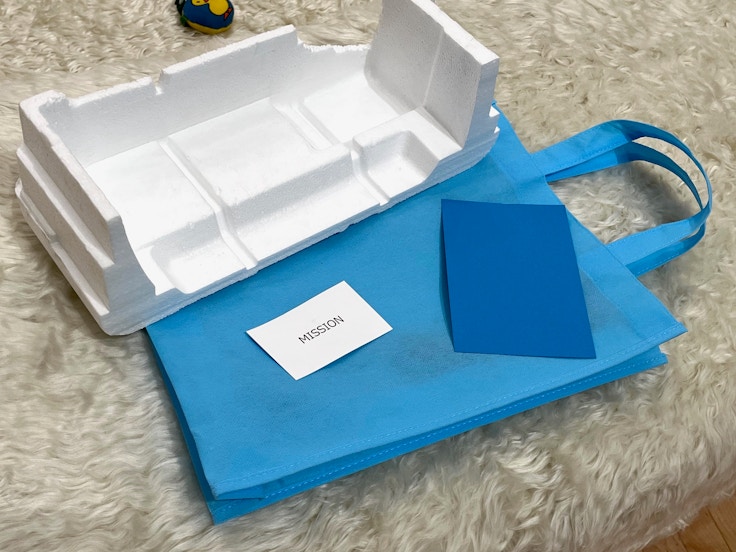 本展の来場者には「ウェルカムキット」として青いバッグが手渡される。この中には発泡スチロール、カード、そして青い紙が入っており、これらを使うことで鑑賞者が能動的に作品に参加することができる。なかでも小さなカードはこれ自体が《ミッション》という作品で、裏面には手に取った人がなすべきミッションが書かれている。内容は詳述しないが、いずれも会場内で何気なく行えるものであり、他の来場者の何気ない仕草も、もしかしするとこのミッションなのかもしれないと勘ぐらせる。