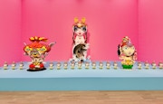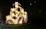 81年に結核を患い、4ヶ月に及ぶ入院生活を余儀なくされた田名網。薬の強い副作用によって幻覚に悩まされたが、そのイメージは極彩色かつキッチュな作品へと昇華されていった。4章「人工の楽園」には、その入院以降に制作された絵画群のほか、幻覚のイメージが幼少期の積み木と結びついた《昇天する家》(1987)などの立体作品が、ひとつの街のように空間を構成する。