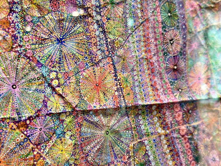 キャンバス代わりに使われたのは、30kgの米袋を切り広げたもの。そのシワをポスカでなぞり、色を埋めていったという。満月の夜のサンゴの産卵をテーマに、満点の星空や宇宙、満月などのモチーフが緻密に描かれた本作。母親の胎内にいた頃の情景や、サンゴの研究者である父親のことなど、作家にとって大切な存在である両親からインスピレーションを受けているという。浅野は「グランプリをいただいてとても嬉しい」と率直な感想を述べた。